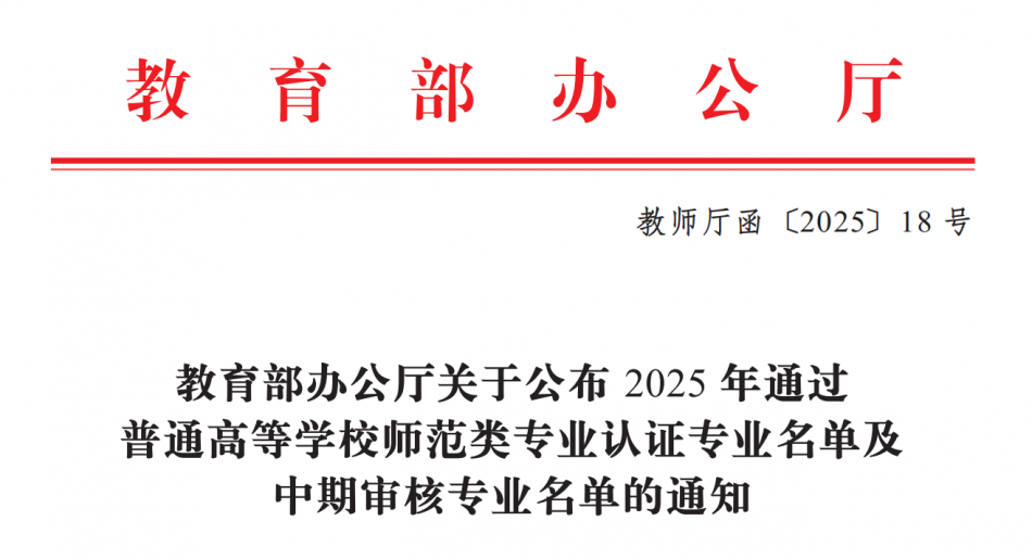 近日,教育部办公厅公布了2025年通过普通高等学校师范类专业认证的专业名单及中期审核专业名单,外国语学院英语专业凭借长期以来扎实的教学积累,成功通过第二级专业认证。