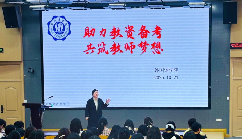 10月21日13:00,外国语学院在文渊楼9102教室开展入学教育系列讲座之“助力教资备考,共筑教师梦想”,帮助2025级新生开启教师资格证备考准备。本次讲座由教研室主任陈琳主讲,2025级全体新生参与。