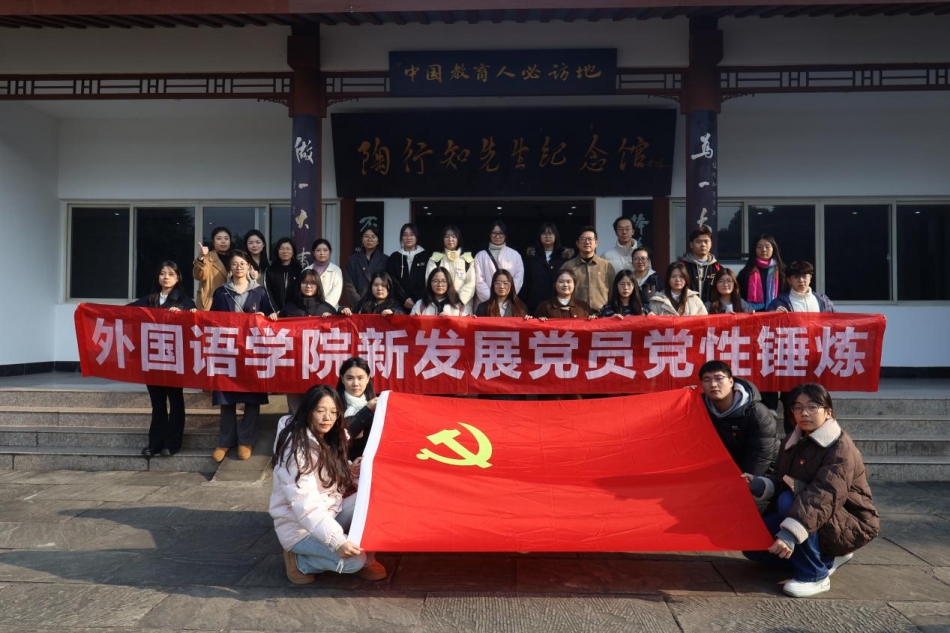 为深入学习贯彻党的二十大精神和习近平总书记关于坚定理想信念、教育强国的重要论述,进一步强化学生党员的思想淬炼与党性修养,2025年11月28日,外国语学院学生第一、第二党支部前往陶行知先生纪念馆和育才学校旧址开展2025年新发展党员党性锤炼活动。学院党总支副书记李巍以及学生第一、第二党支部书记郑梦寒、查坤带领20余名师生党员参加了本次活动。