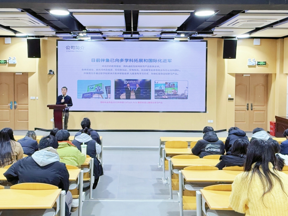 宣讲会伊始,王浩结合自身经验分析了教育培训市场中的求职陷阱,提醒同学们提高警惕,仔细甄别。接着,他介绍了公司在少儿教育领域的稳步发展,特别是在“双减”和疫情影响下,伴鱼仍保持着持续增长的势头并重点突出伴鱼的核心竞争力,涵盖内容、技术和师资三大体系。随后,在出海业务布局方面,他特别强调急需中英双语教师,指出了兼职转全职的机会及岗位成长路径,并提到了优质转介绍奖励、清晰的应聘流程、岗位要求和薪资福利。