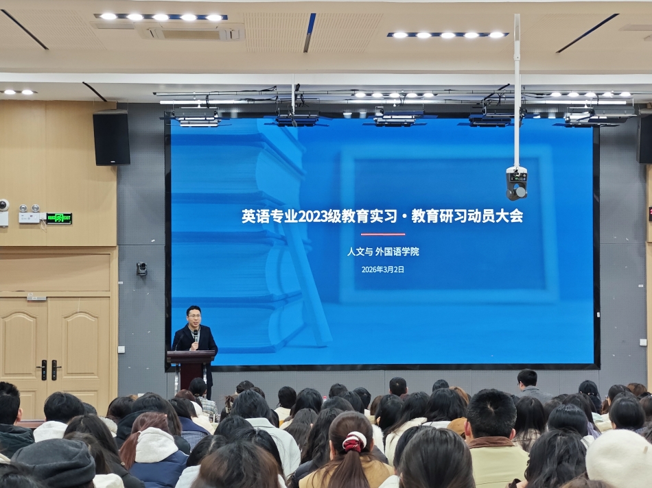 2026年3月2日,人文与外国语学院在文渊楼9102教室召开2023级英语专业教育实习、教育研习动员大会。学院副院长兼党总支副书记秦中书、副院长杨高强、党总支副书记杨成松,英语专业实习指导教师、2023级辅导员及全体英语专业学生参加会议。大会由教研室主任陈琳主持。